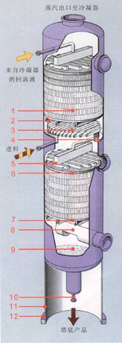 2、支撐柵板 3、液體收集器 4、集液環 5、多級槽式液體分布器 6、填料壓圈 7、支撐柵板 8、蒸汽入口管 9、塔底 10、至再沸器循環管 11、裙座 12、底座環 此結構適合于直徑大于等于800mm的填料塔。 |