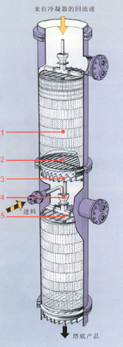 1、規整填料 2、支撐柵板 3、液體收集器 4、降液管 5、管式液體分布器 此結構適合于直徑小于800mm的填料塔。 |